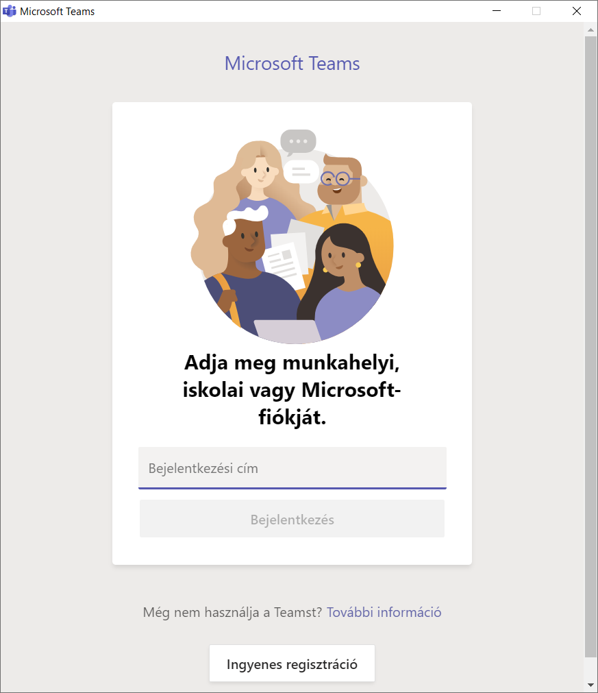 A Teams-nek van ingyenes verziója is, viszont a bejelentkezéshez Microsoft fiók szükséges. Ha valamilyen szervezet tagja, akkor a szervezetétől kapott felhasználónévvel, illetve jelszóval jelentkezhet be. A bejelentkezésnél meg kell adni azt is, hogy milyen szervezethez csatlakozik a Teams-szel. Ez utólag módosítható, de egyszerre csak egy szervezethez tud csatlakozni.