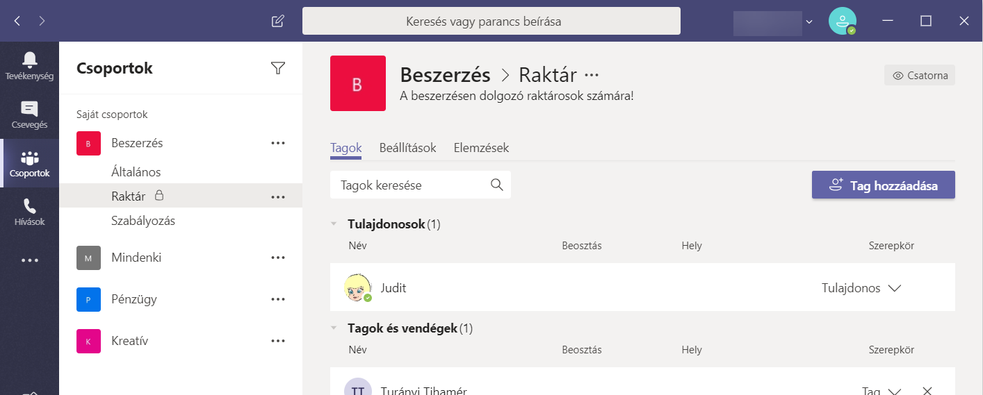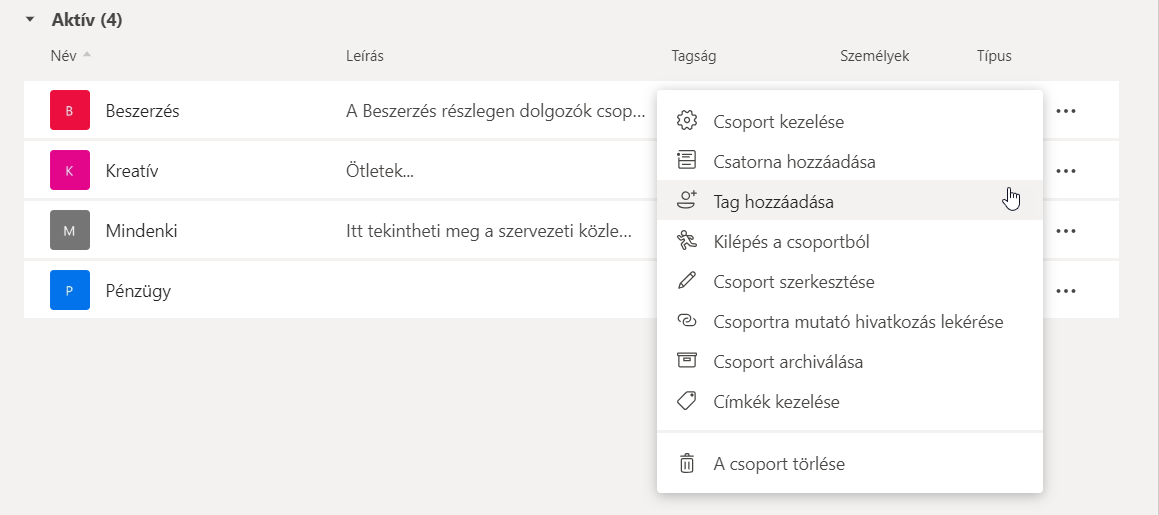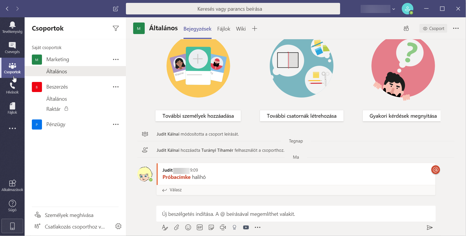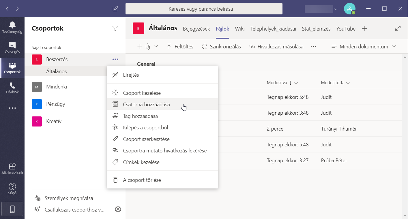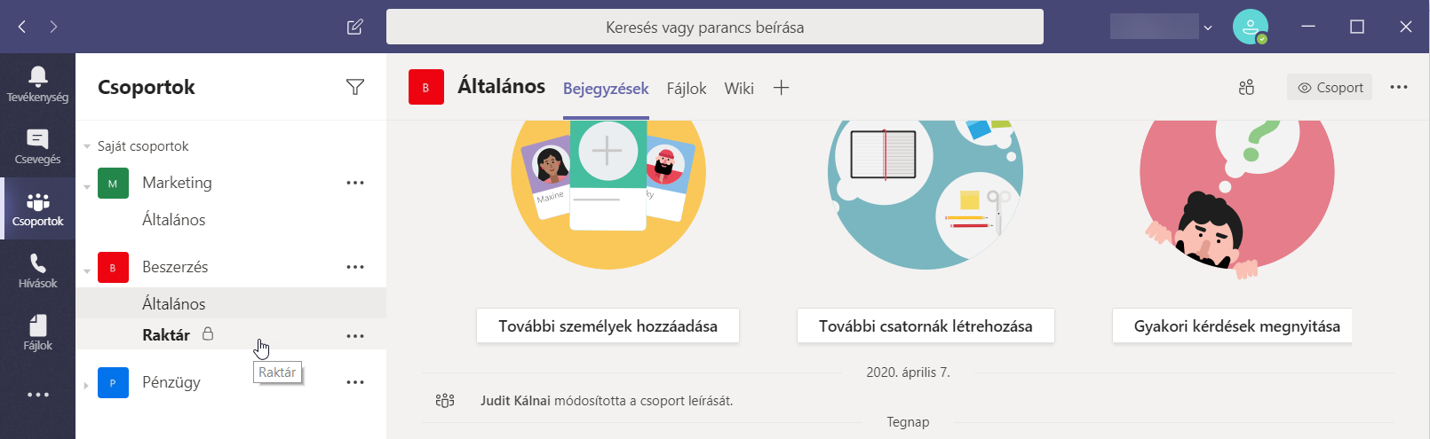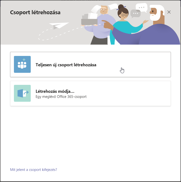 A Teams-en belül létrehozhatunk több csoportot is, ahova felvehetünk partnereket tagként. A csoportokon belül több ún. csatorna lehet, ahol az adott csoport tagjait oszthatjuk szét, például egy adott projekt egy csoport, a projekt különböző folyamatai pedig a csatornák.