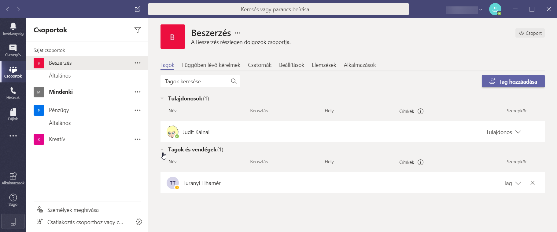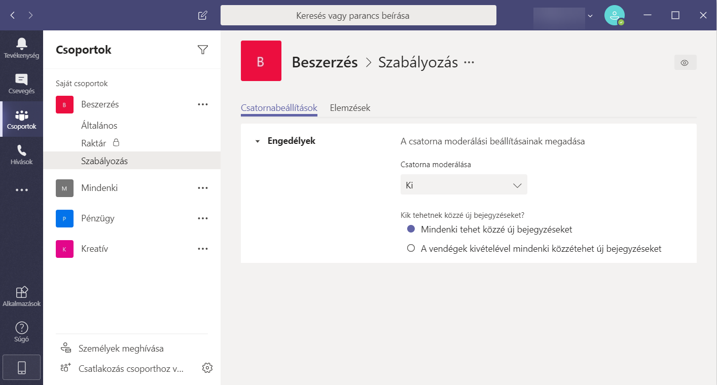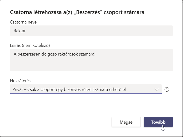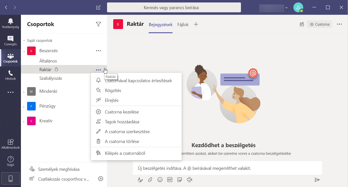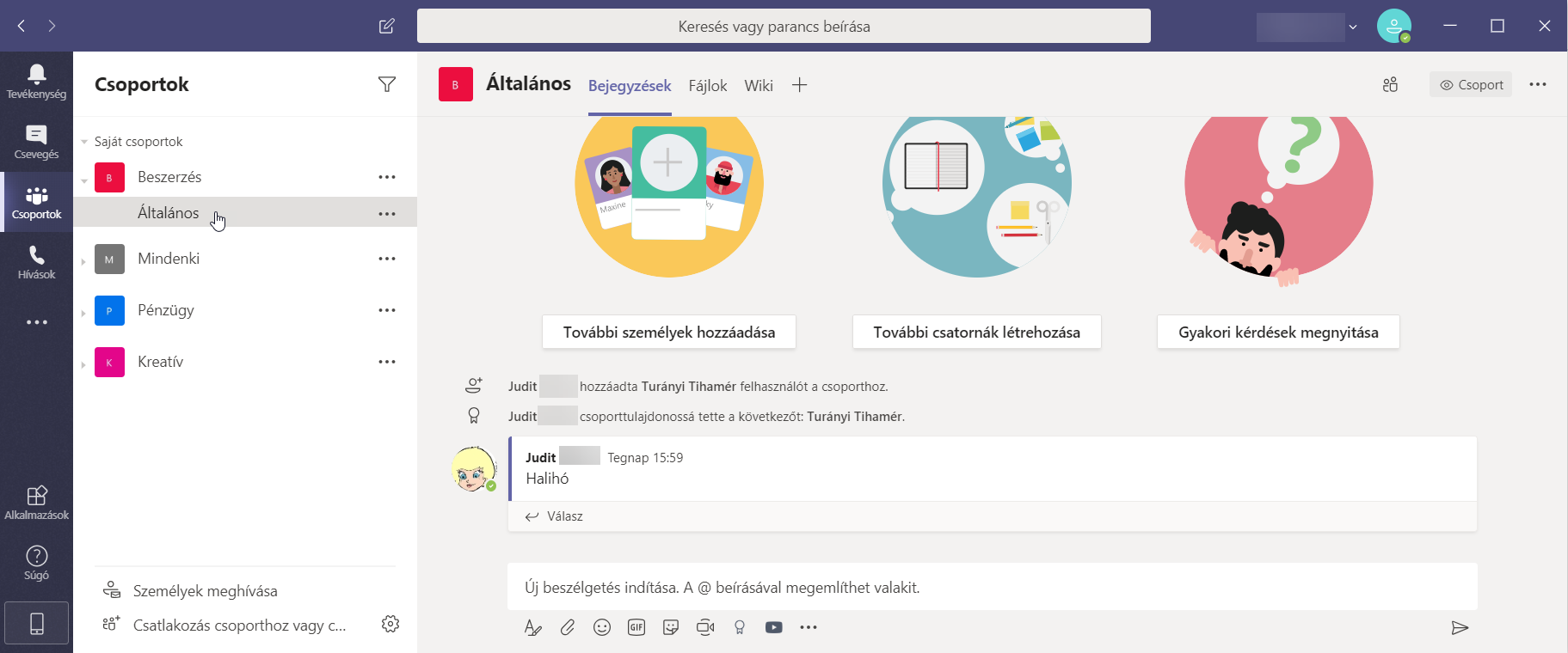 A Teams-en belül létrehozhatunk több csoportot is, ahova felvehetünk partnereket tagként. A csoportokon belül több ún. csatorna lehet, ahol az adott csoport tagjait oszthatjuk szét, például egy adott projekt egy csoport, a projekt különböző folyamatai pedig a csatornák.