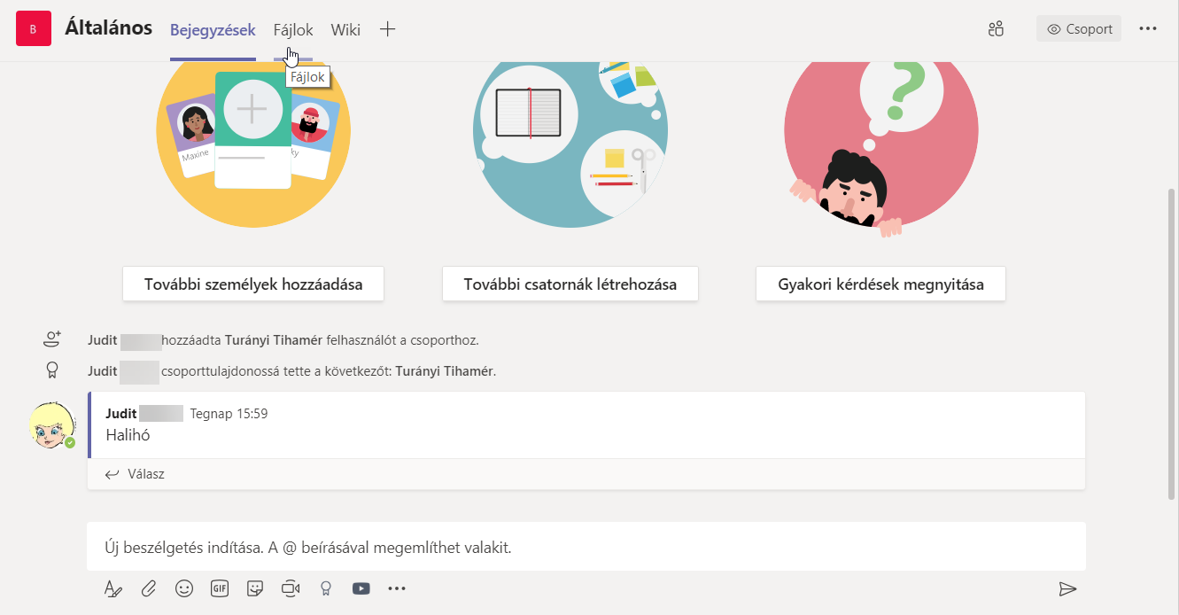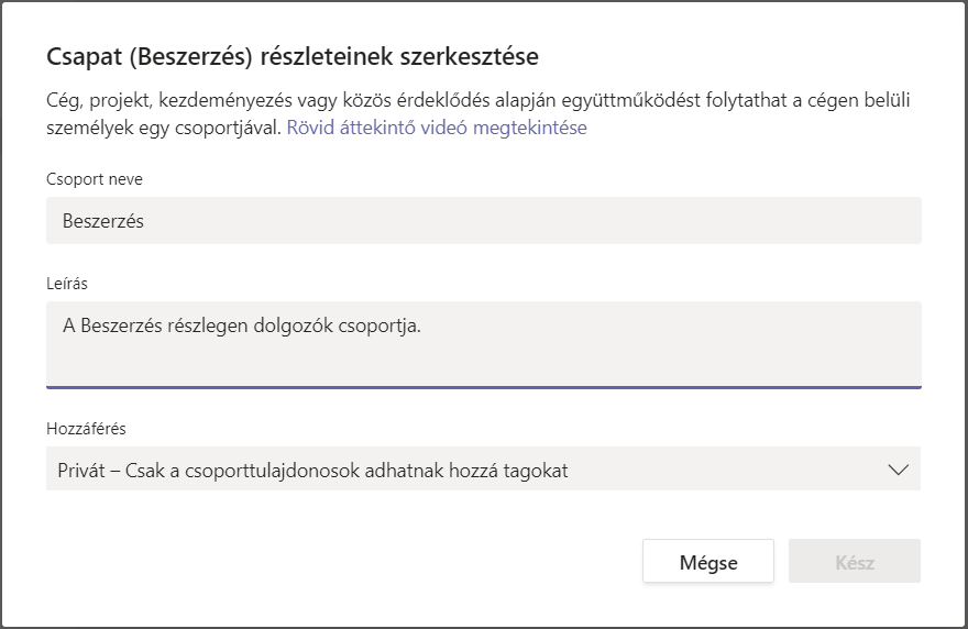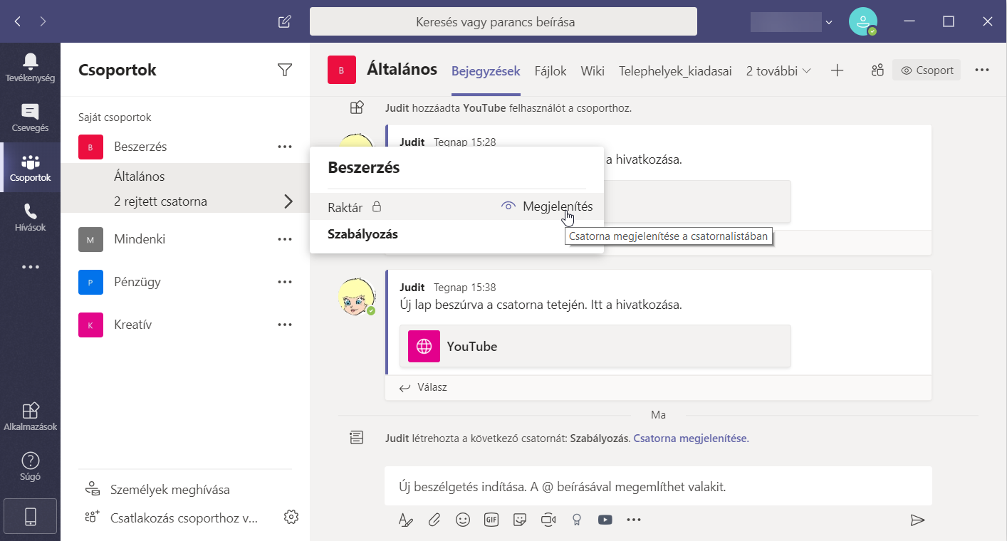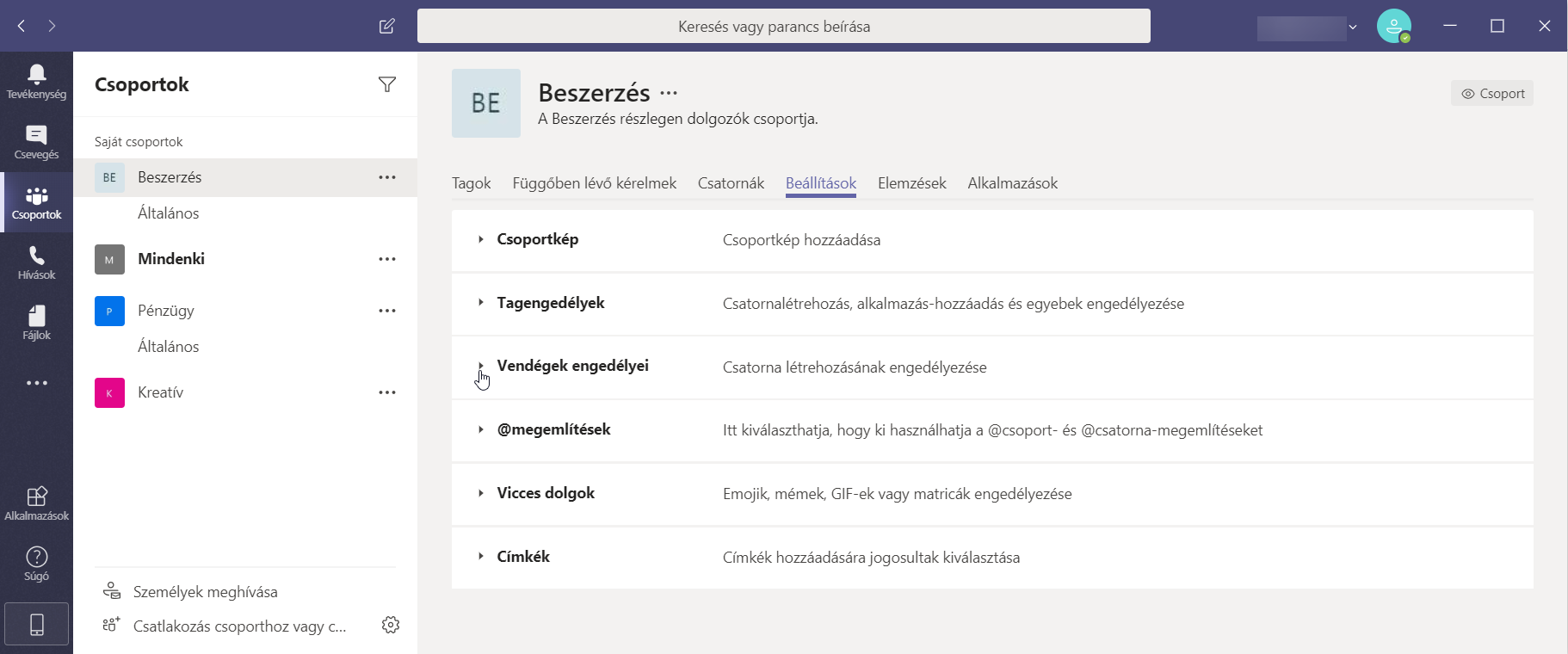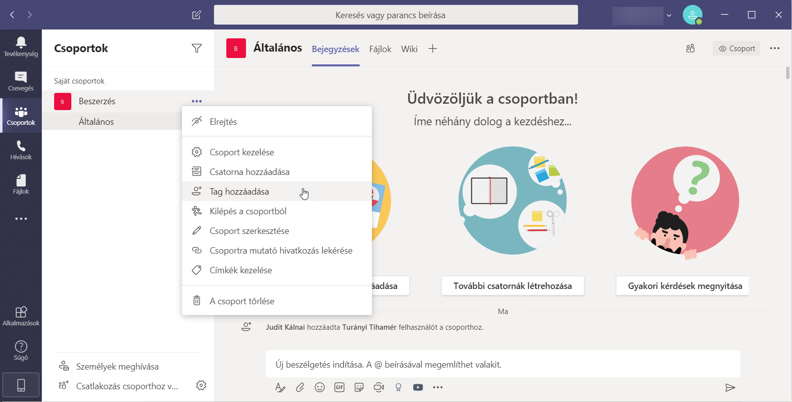 A Teams-en belül létrehozhatunk több csoportot is, ahova felvehetünk partnereket tagként. A csoportokon belül több ún. csatorna lehet, ahol az adott csoport tagjait oszthatjuk szét, például egy adott projekt egy csoport, a projekt különböző folyamatai pedig a csatornák.