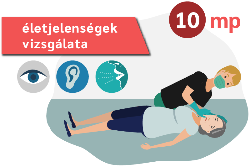 A beteg fejét homlokánál és állánál fogva enyhén hátrahajtjuk, fülünket az arca fölé helyezzük. Hármas érzékeléssel 10 másodpercig figyeljük a légzést. Amennyiben a betegnek van légzése, biztosítsunk szabad légutakat! Ha beteg nem lélegzik, kiáltsunk segítségért! Hívjuk, vagy hívassuk a mentőket a 104 vagy a 112-es telefonszámon! Kérjünk segítséget az újraélesztéshez! Amennyiben a beteg közelében van defibrillátor, juttassuk azt oda és bekapcsolás után kövessük a készülék utasításait! A telefonhívás során a mentők diszpécsere végig vonalban marad velünk a mentő megérkezéséig. Hasznos tanácsait utasításait fogadjuk meg!